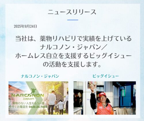 「情報の新選組」オプティマ・ソリューションズは、薬物リハビリで実績を上げているナルコノン・ジャパン/ホームレス自立を支援するビッグイシューの活動を支援します。