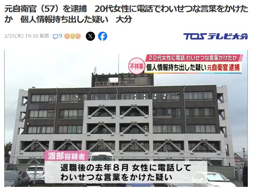 今回逮捕された男性は、2024年まで自衛隊大分地方協力本部別府地域事務所の所長を務めており、在職中に、自衛隊への志願票から面識のない20代女性の携帯電話の番号をメモに写し取り、私的に持ち出したとのことです。そして退職後の2025年8月にその電話番号を使用して女性に電話をかけ、わいせつな言葉を発したとのことです。