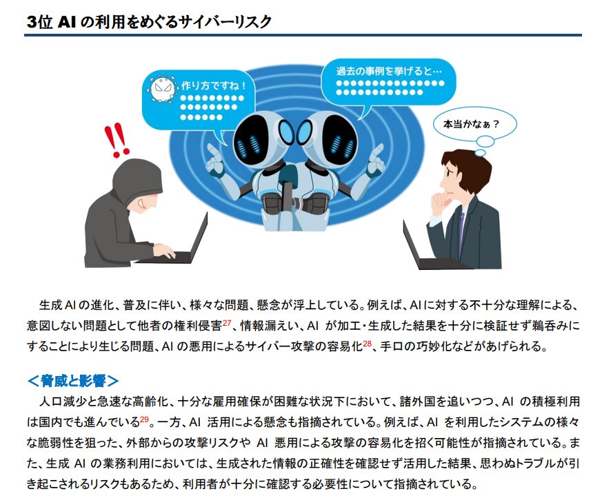 また、今年初めてランクインし、第3位となったのが「AIの利用をめぐるサイバーリスク」です。
